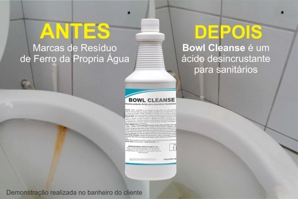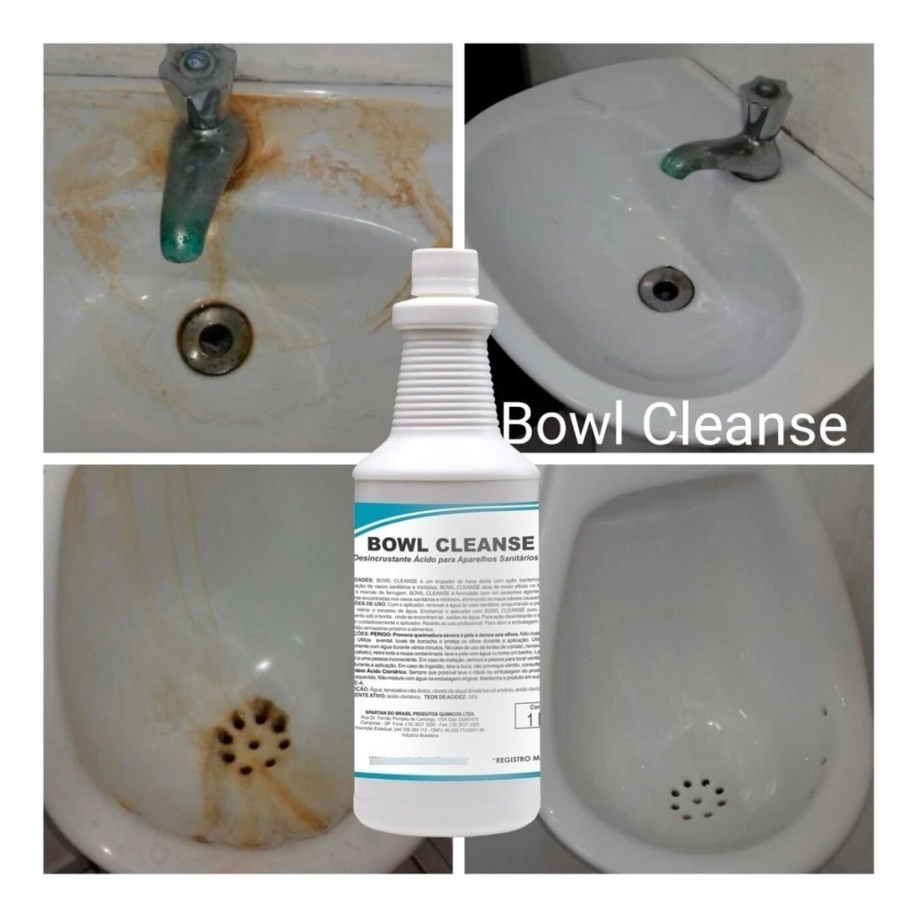 BOWL CLEANSE atua de modo eficaz no trabalho de remoção de incrustações de sais de urina, depósitos orgânicos e marcas amareladas e de ferrugem.