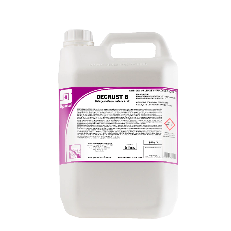 O DECRUST B é um limpador com poderosa ação sobre resíduos de cimento e argamassa em pisos e paredes de concreto, porcelanato, cimentados e pedras porosas em geral (mineira, miracema, ardósia, carranquinha, etc.). Pode ser utilizado na limpeza de betoneiras e caminhões de usinas de concreto. O DECRUST B dissolve as camadas finas de concreto e argamassa que ficam aderidas nas superfícies, sem prejudicar ou atacar as mesmas por conter inibidores de corrosão na sua formulação.